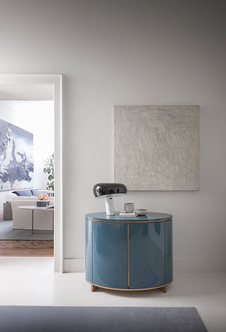 Elliot. Szafka z lakierowanego drewna z dwojgiem drzwi i jedną półką. Ujmuje zaokrąglonym, czystym kształtem i wykończeniem pozwalającym dopasować ją i do salonu, i do sypialni. Szeroka gama kolorystyczna, lakier matowy lub błyszczący, a kontrastująca z tym rama proponowana jest w intrygującym brązowionym mosiądzu, który nadaje Elliotowi cechy biżuterii.